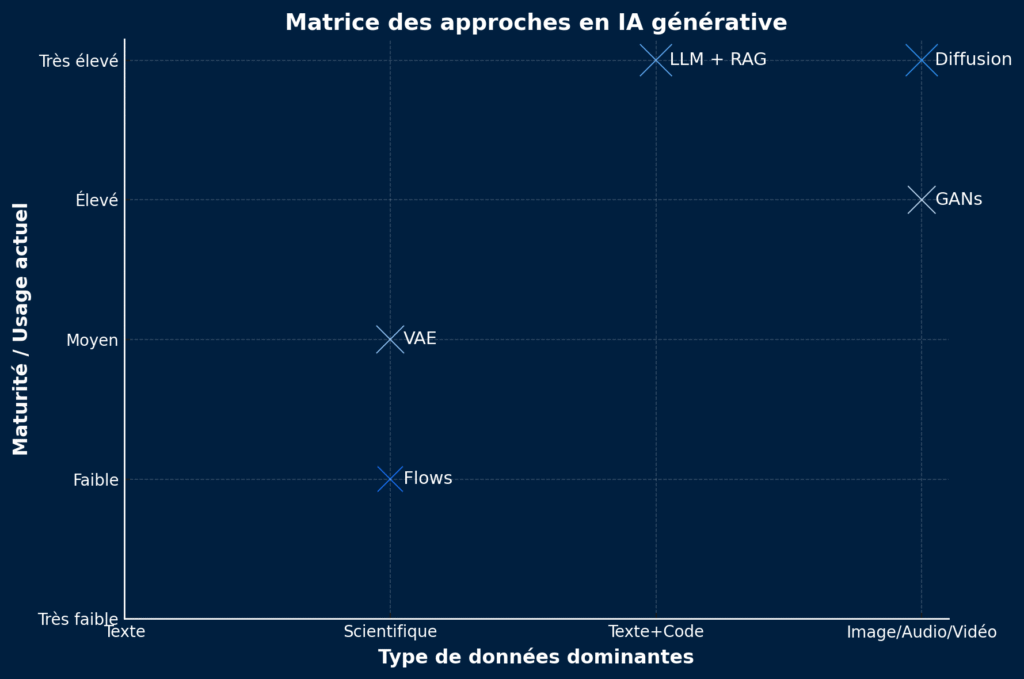 Flows (Normalizing Flows) | Audio (vocodeurs), modélisation scientifique, densité exacte | – Probabilité explicite- Génération réversible- Utile pour audio et sciences | – Complexité des architectures- Moins adoptés que LLM/diffusion |