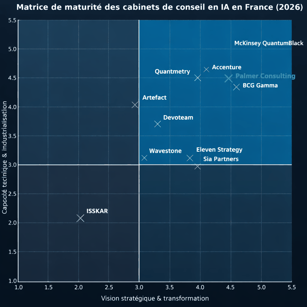 | Palmer Consulting | Generative AI, data-driven management, digital transformation & UX | Agile approach, test & learn, integrated scalability | BNP Paribas, Société Générale, Crédit Agricole | Combination of strategic + technical expertise, support for SMEs and large groups, focus on ROI and adoption | ETIs and large groups seeking to industrialize their AI projects |