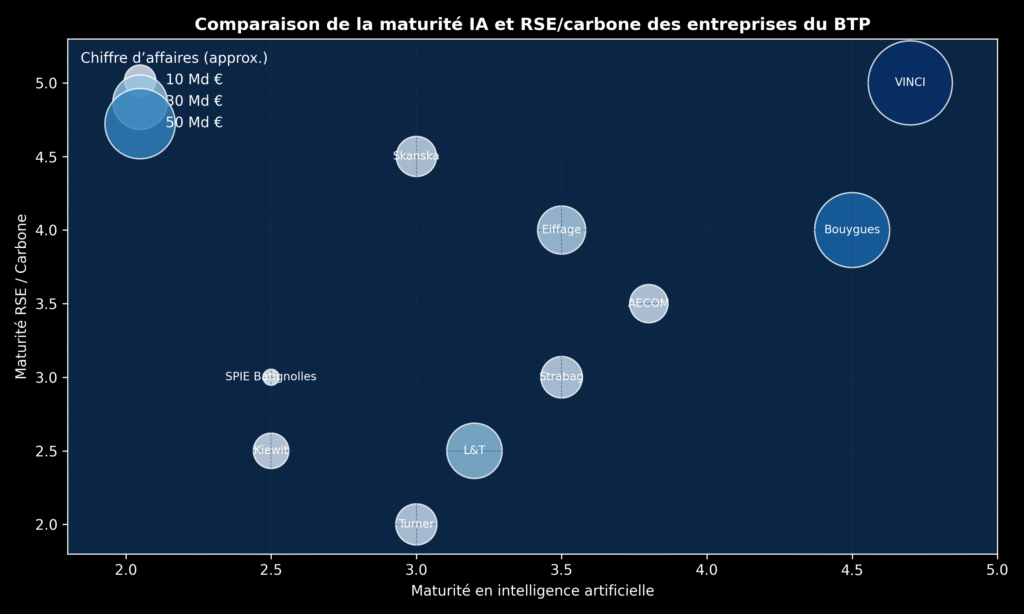 Face à l’urgence climatique et à la pression réglementaire, le secteur du BTP est contraint de revoir ses processus d’achat et ses méthodes de production. Les grandes entreprises qui dominent ce marché utilisent désormais l’intelligence artificielle (IA) et la science des données (Data Science) pour réduire l’empreinte carbone de leurs projets, optimiser l’utilisation des matières premières et renforcer la résilience des chaînes d’approvisionnement. Là où certains groupes français se contentent de démarches exploratoires, des concurrents comme Bouygues Construction, Strabag SE ou Vinci Construction ont déjà industrialisé des solutions qui transforment leur modèle d’affaires.